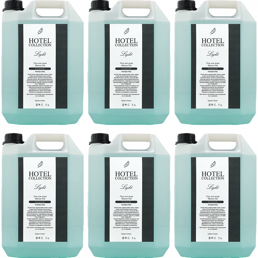 Гель для душа Hotel Collection Light в полупрозрачной канистре объемом 5 л. Подходит для заправки гостиничных диспенсеров. Гель содержит провитамин B5. Протестирован дерматологически и соответствует ГОСТ 31696-2012.