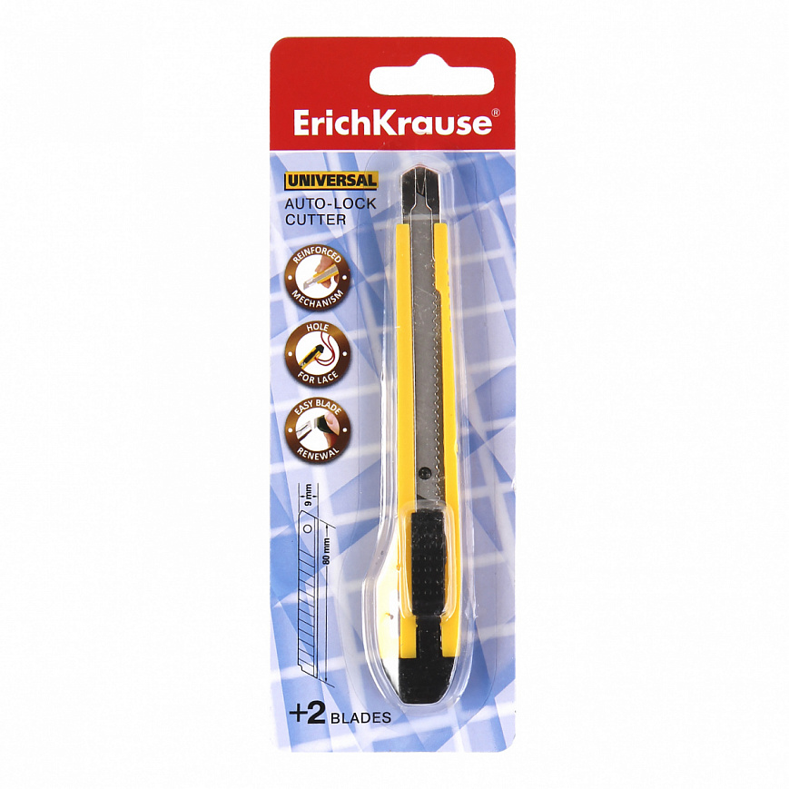Нож канцелярский, 9 мм, автофиксатор, пластик, усиленный, 2 лезвия, европодвес, Erich Krause