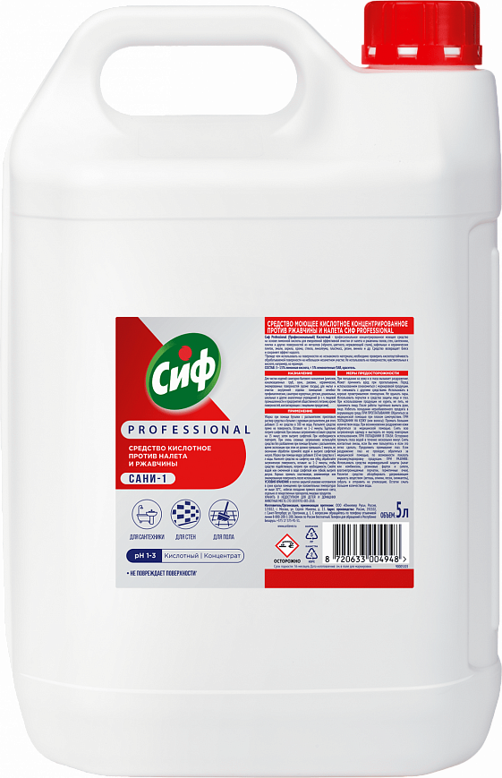 Средство против ржавчины и налета Cif Professional — это профессиональное концентрированное средство на основе лимонной кислоты. Cif Professional возвращает поверхностям блеск и чистоту, сохраняя их длительное время. Средство подходит для эффективного очищения налета и ржавчины на сантехнике, плитке, стенах, полах и других поверхностях. Моющее средство Cif Professional идеально подходит для уборки в туалете и ванной комнате: для чистки унитазов и раковин, канализационных труб. Кислотное средство Cif можно использовать на хромированных, керамических, эмалированных (кроме посуды) и стеклянных поверхностях, а также поверхностях из нержавеющей стали. В состав Cif Professional входит лимонная кислота, которая эффективно борется с налетом (даже на сильно загрязненных поверхностях) и ржавчиной, оставляя чистоту и свежесть на длительное время. Большой объем и концентрированная формула позволяют экономно расходовать средство, которого хватит надолго.