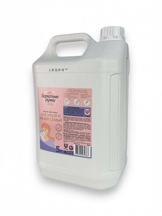 Бархатные ручки – жидкое крем-мыло для рук Для меня и моей семьи, представленное в объеме 5 л. Гипоаллергенная формула подходит для постоянного использования всей семьей, в том числе детьми с 4-х лет. Не содержит красителей и имеет деликатный аромат. Не сушит кожу.