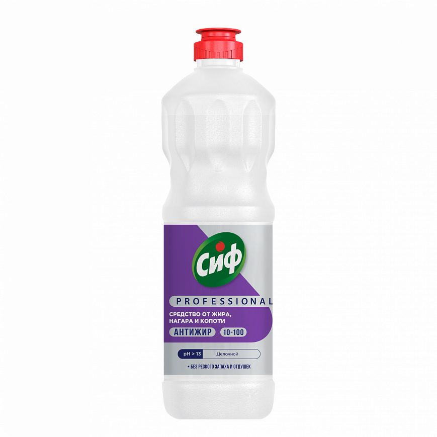 Сиф Prodessional Антижир - профессиональное щелочное средство для удаления жировых и белковых загрязнений на гриле, плите, вытяжных зонтах и других рабочих производственных поверхностях, в том числе контактирующих с пищей. Удаляет жир, нагар и копоть. Без резкого запаха и отдушек. Подходит для удаления загрязнений с пола.