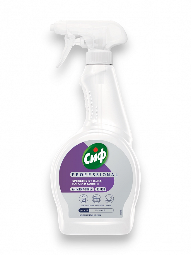 Сиф Prodessional Антижир - профессиональное щелочное средство для удаления жировых и белковых загрязнений на гриле, плите, вытяжных зонтах и других рабочих производственных поверхностях, в том числе контактирующих с пищей. Удаляет жир, нагар и копоть. Без резкого запаха и отдушек. Подходит для удаления загрязнений с пола.