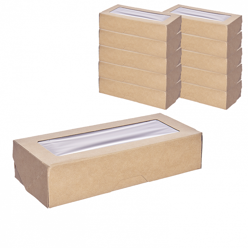 Одноразовые контейнеры, изготовленные из крафт картона, очень удобны и отличаются широким спектром применения. Однотонная картонная коробка с окошком нередко используется в заведениях для подачи блюд на вынос.Контейнер предназначен для готовых блюд, салатов и десертов, кондитерских изделий, пасты и лапши, суши и роллов.