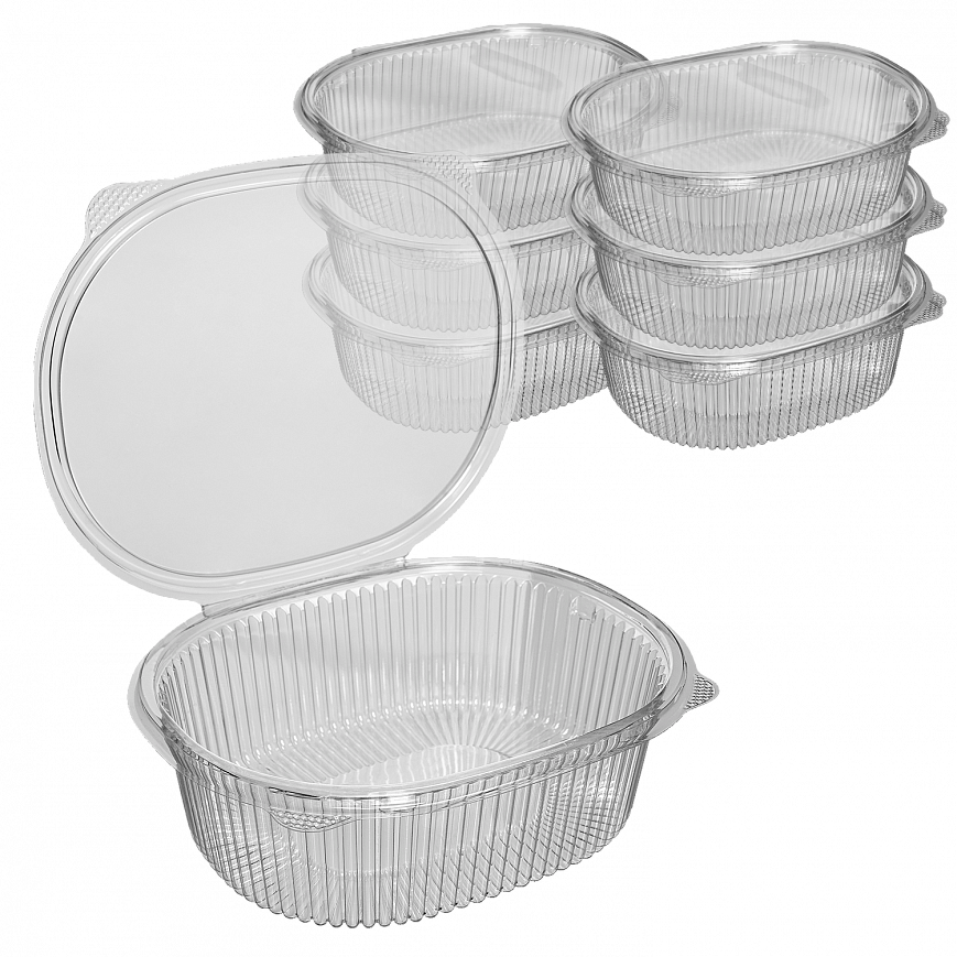 Пластиковый одноразовый контейнер-ракушка предназначен для фасовки салатов, десертов, овощей, солений, холодных закусок.