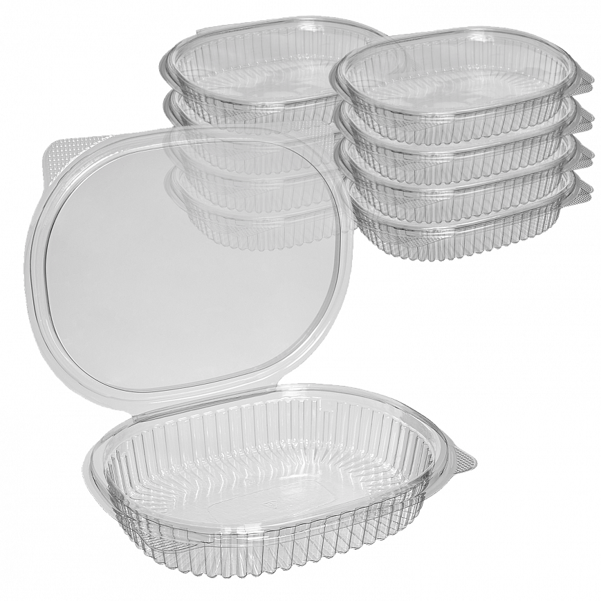 Пластиковый одноразовый контейнер-ракушка предназначен для фасовки салатов, десертов, овощей, солений, холодных закусок.
