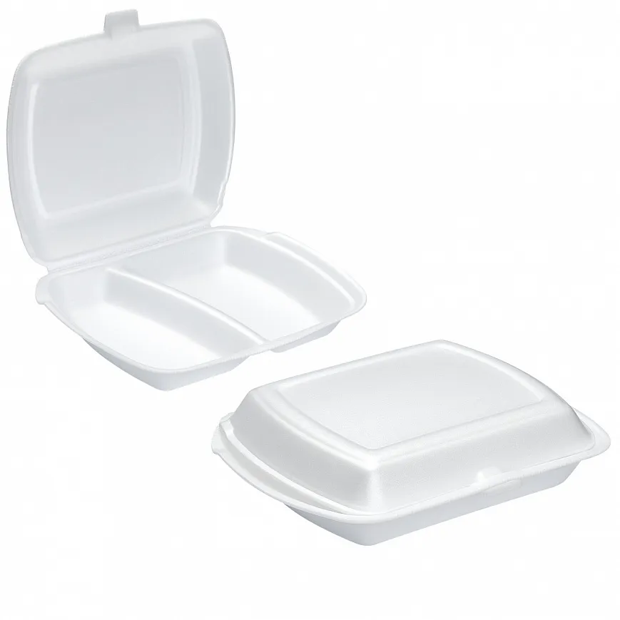 Одноразовый ланч-бокс с двумя секциями для упаковки готовой еды на вынос. Выполнен из вспененного полистирола, который хорошо сохраняет температуру и обеспечивает сохранность продуктов при транспортировке. Наличие отсеков позволит упаковать два разных блюда в один контейнер. Полностью отвечает гигиеническим нормам. Ланч-бокс можно использовать для разогрева продуктов в микроволновой печи. Внешняя поверхность подойдет для размещения логотипа или рекламной информации. Цвет — белый.